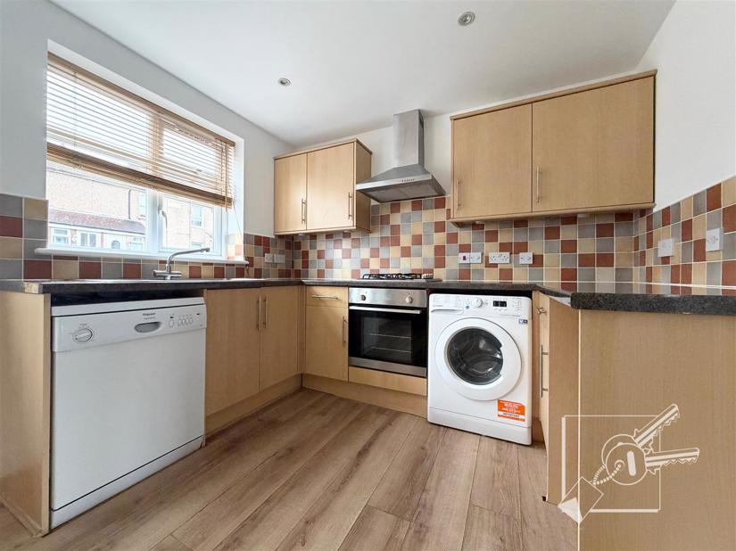 The property has been redecorated throughout and benefits from new carpets. The ground floor offers an entrance hallway, a spacious kitchen and a bright living room with patio doors opening onto the rear garden.