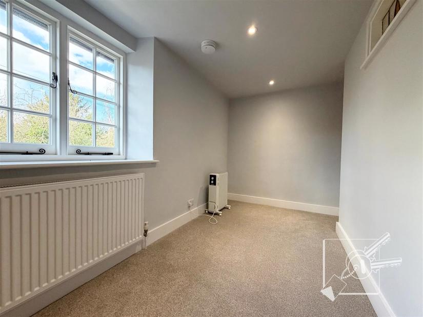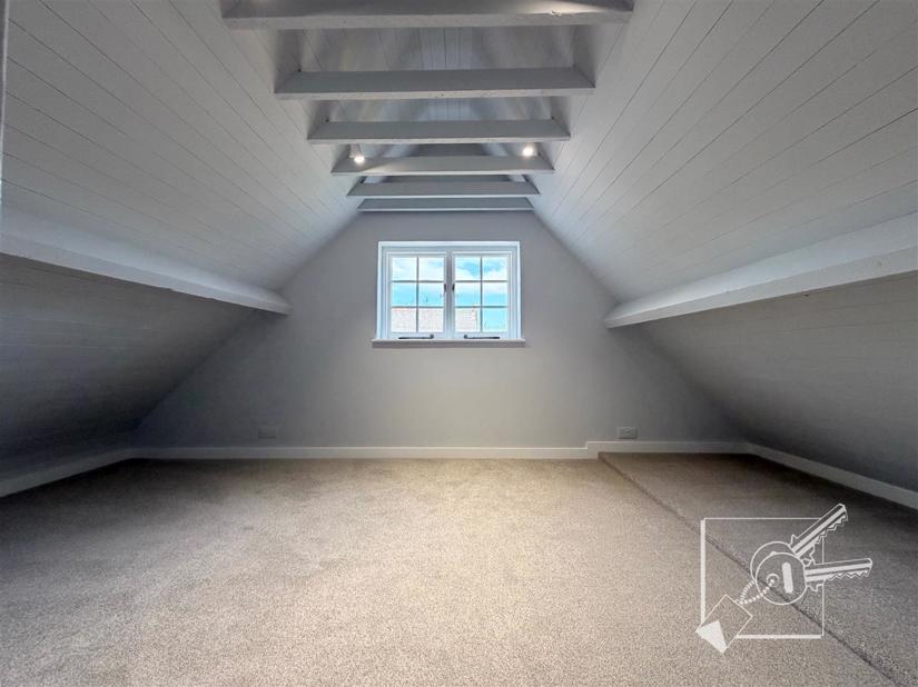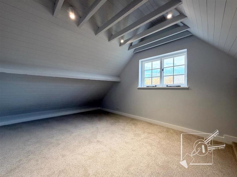 Upstairs, there is a large landing, a bathroom, and a double bedroom. Further stairs lead to the second floor, which offers a second double bedroom.