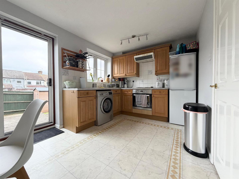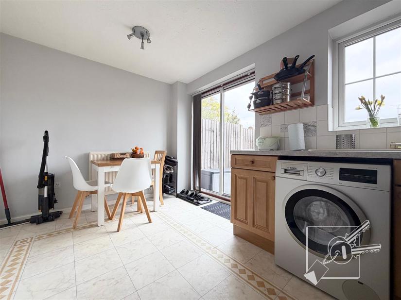 The property features a welcoming living room that flows seamlessly into the kitchen, which benefits from patio doors opening out to the garden.