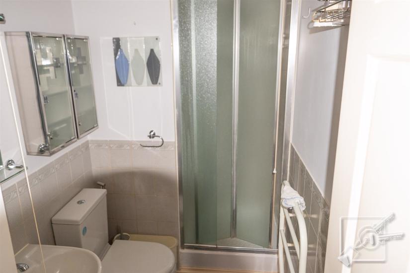 White suite comprising shower cubicle, wash basin and low level w.c. Tiled walls, electric heated towel rail, extractor fan, medicine cabinet.