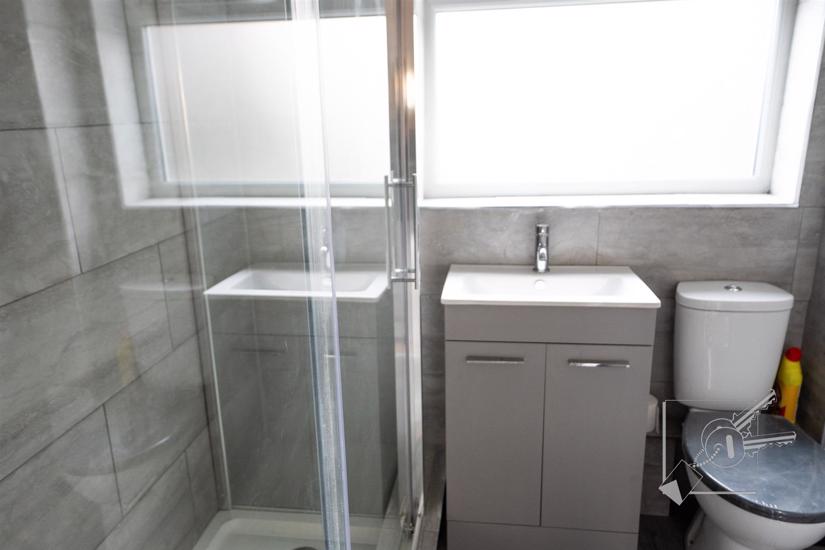 A double glazed window to rear, radiator, contemporary localised tiling to walls, two radiators. Suite includes double shower cubicle with glass sliding door & Bristan shower unit, pedestal wash basin and low level w.c..