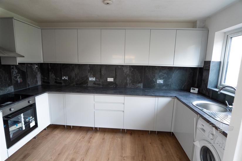Double glazed window to side. Newly fitted wall and base units, complimentary work tops, round stainless steel sink and drainer, Built in oven, hob and extractor. Plumbed for washing machine. contemporary local tiling to walls.