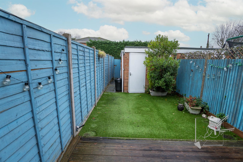 A fully fenced westerly aspect rear garden, with artificial lawn, timber decking and rear gate leading out to rear vehicle access road.