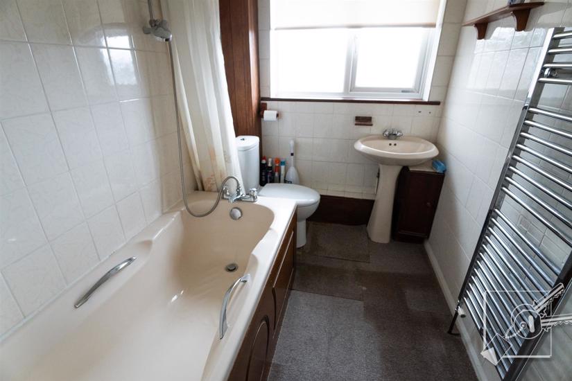 A suite comprising low level w.c., panelled bath with mixer taps and shower attachment and pedestal basin. Double glazed window to the rear of the property. Carpeted floor tiles. Tiled walls and heated towel rail.