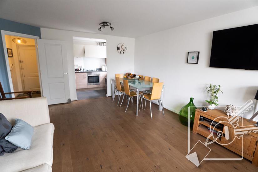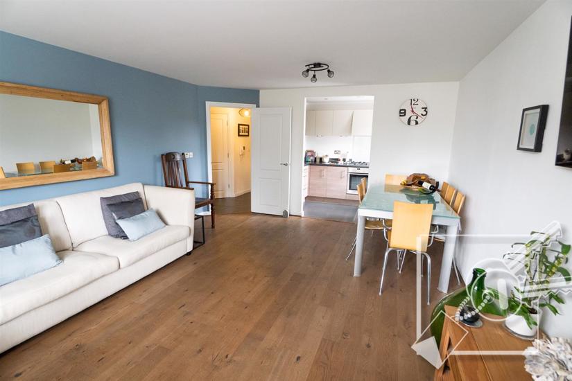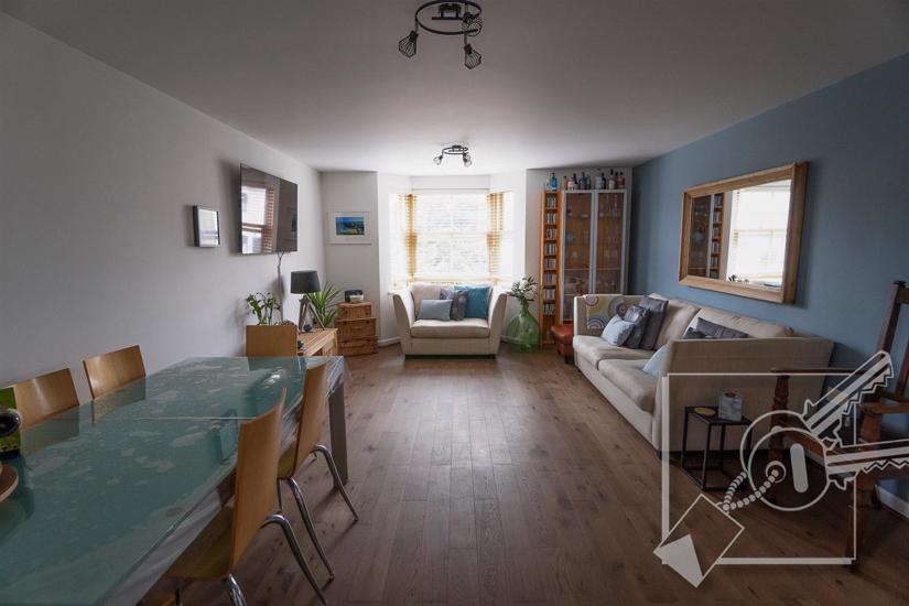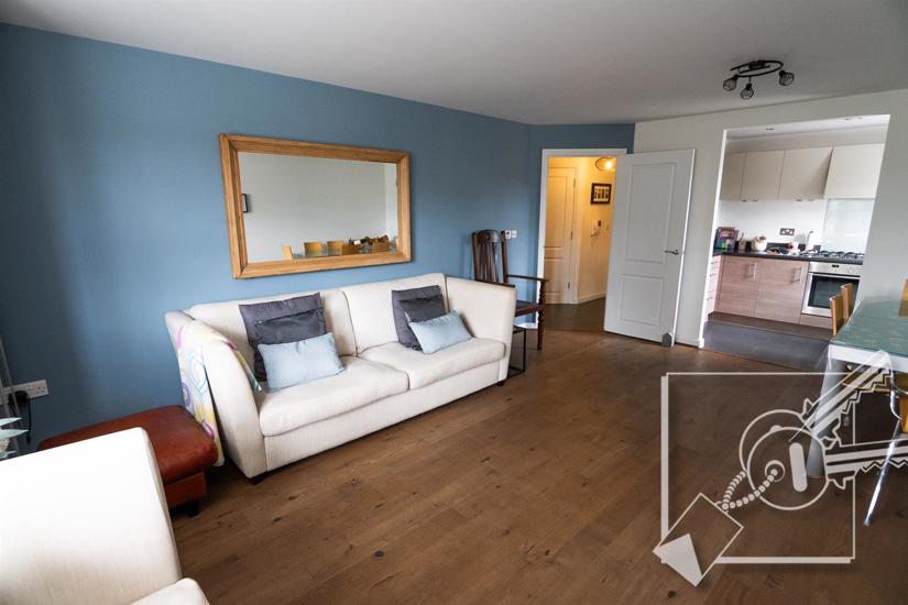 Double glazed bay window, laminate floor, individual room thermostat. Plenty of space for a full size dining table, chairs and lounge furniture. Wide opening to: