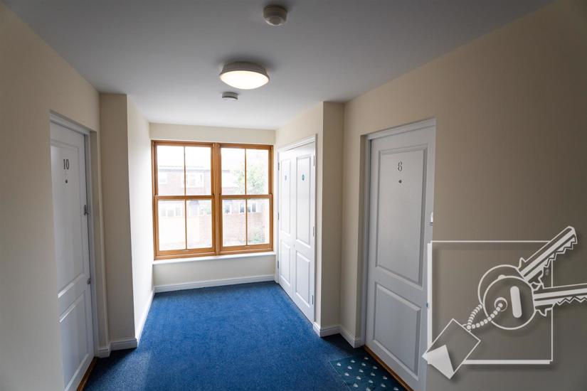 External entry phone system and individual mail boxes. Glazed doors leading through to communal hall way. Stairs leading to first floor.