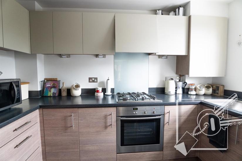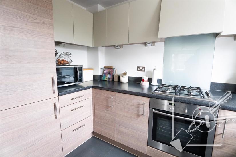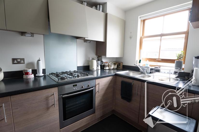 Double glazed window to front, tiled floor. Fitted with modern woodgrain effect wall and base cupboards, ample worksurface space, built in gas hob with extractor above and built in oven, integrated fridge/freezer and integrated washing machine, one and a half bowl sink and drainer.