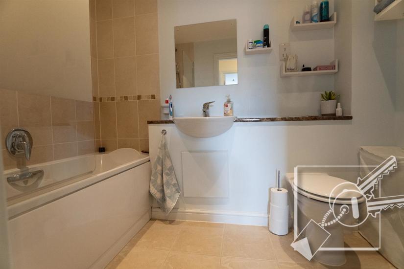 White suite comprising panelled bath with shower over and glass screen, vanity wash basin, low level w.c. Tiled floor.