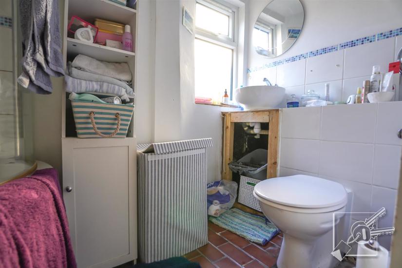 Double glazed window to side. White suite comprising panelled bath with shower over and glass screen, low level w.c., pedestal wash basin. Radiator, tiled splashbacks, tiled floor. Wall mounted "Main" Combi boiler.