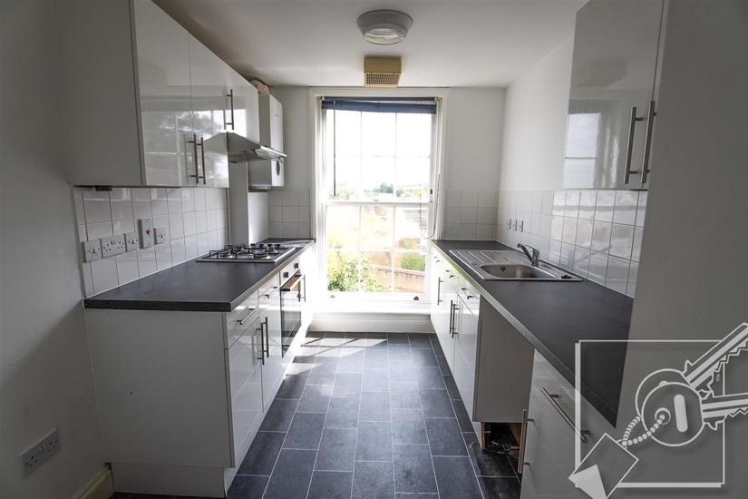 Georgian style sash window over looking the Fort Gardens. Gravesend Promenade and River Thames. Fitted with white wall and base cupboards, gas hob with extractor hood above, built in electric oven, stainless steel sink and drainer, spaces and plumbing for washing machine, space for fridge/freezer. Wall mounted Worcester boiler for hot water and central heating.