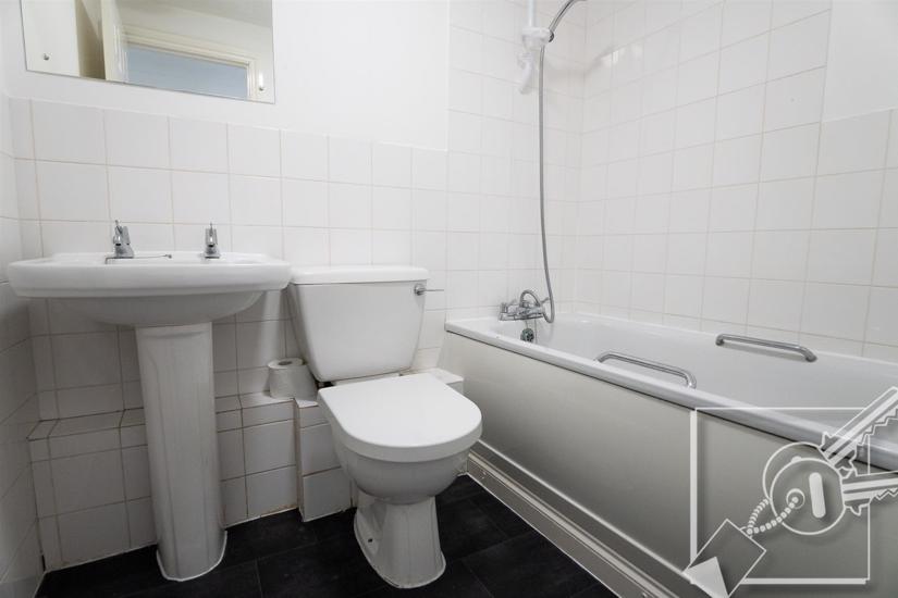 White suite comprising panelled bath with shower mixer taps, pedestal wash basin with fitted wall mirror above, low level w.c. Vinyl floor, part tiles walls, radiator.