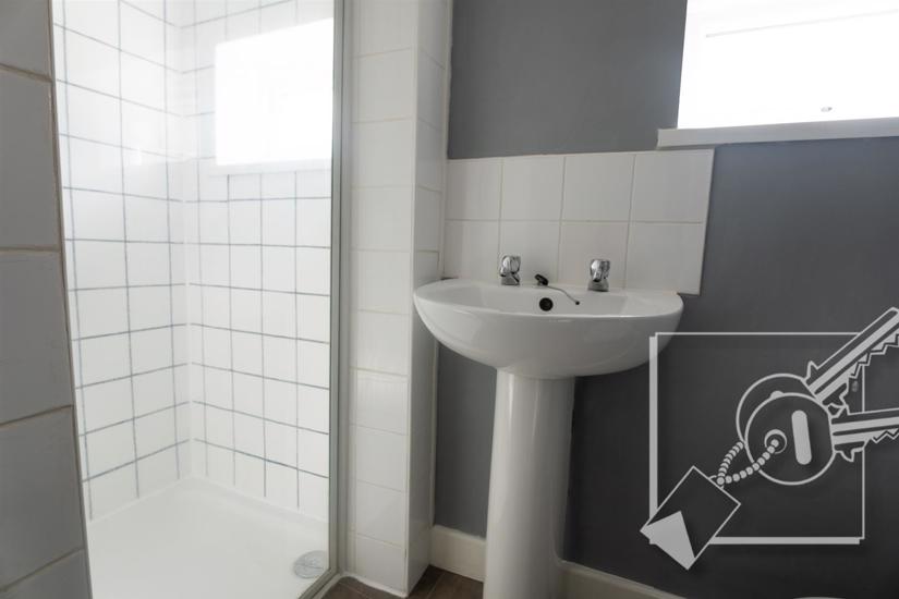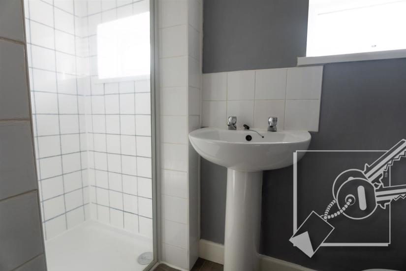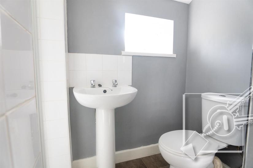 Double glazed window to rear, vinyl floor, heated towel rail. Shower cubicle, pedestal wash basin, low level w.c.