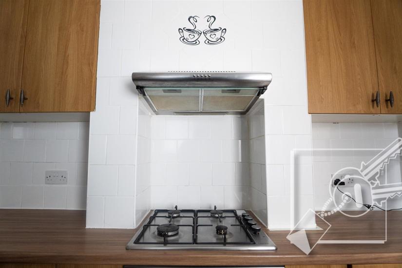 Double glazed window to side and door to side giving access to garden. Fitted wall and base cupboards, stainless steel sink and drainer, ample work surface space, built in " Lamona" gas hob with extractor hood above and built in oven. Vinyl floor covering.