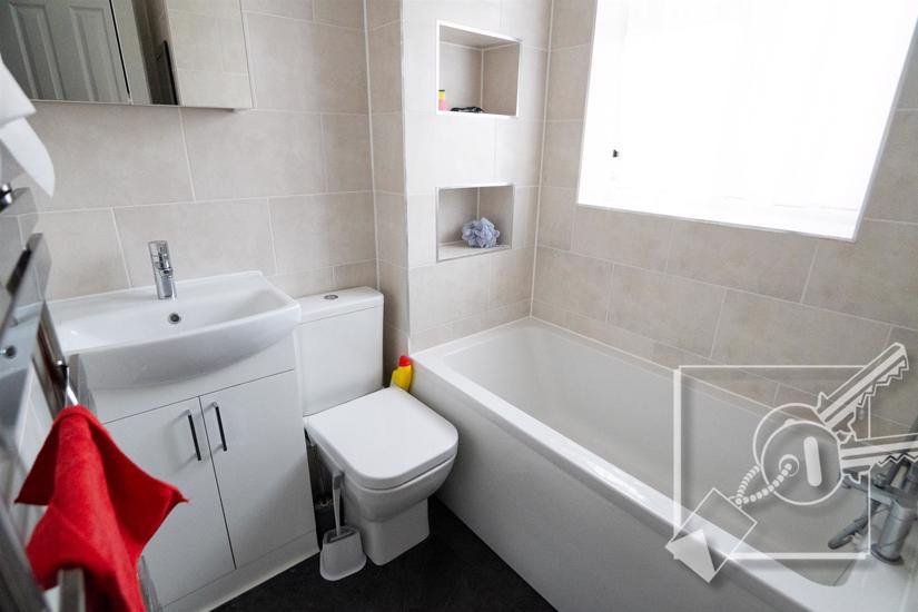 Double glazed window to front. Re fitted in 2022 with a modern white suite comprising panelled bath with shower mixer taps, low level w.c. and vanity wash basin with mixer tap. Tiled walls including two recessed shelves over bath, laminate tile effect flooring, heated towel rail.