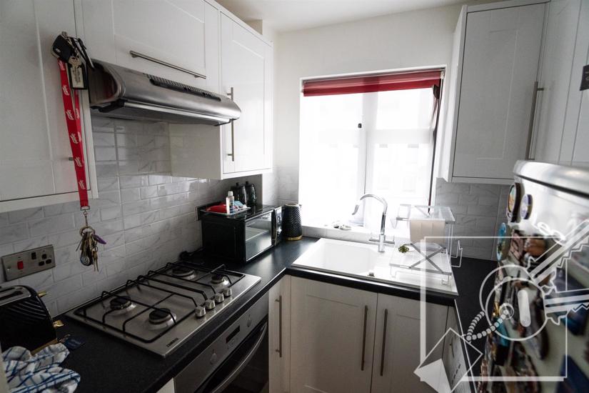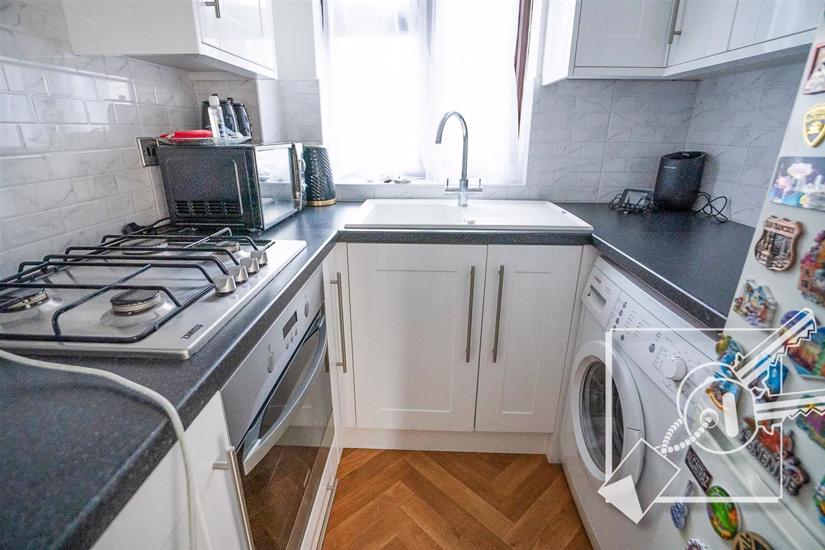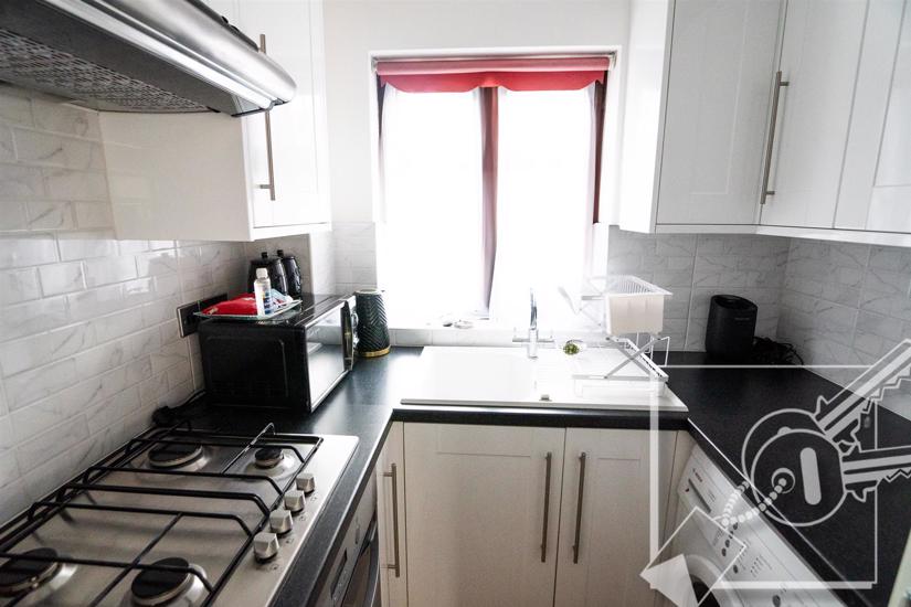 Double glazed window to front. fitted with modern white gloss shaker style wall and base units, complimentary work surfaces, white granite effect single sink and drainer with mixer tap, Built in Zanussi gas hob with matching Zanussi extractor hood above and Zanussi built in oven. Plumbed and space for washing machine, space for fridge/freezer, local tiling to walls.