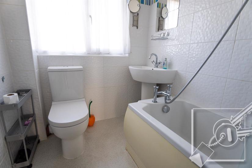 Double opaque window to rear. White suite comprising panelled bath with shower mixer taps and glass shower screen, pedestal wash basin, low level w.c., vinyl flooring, heated chrome towel rail, tiled walls.