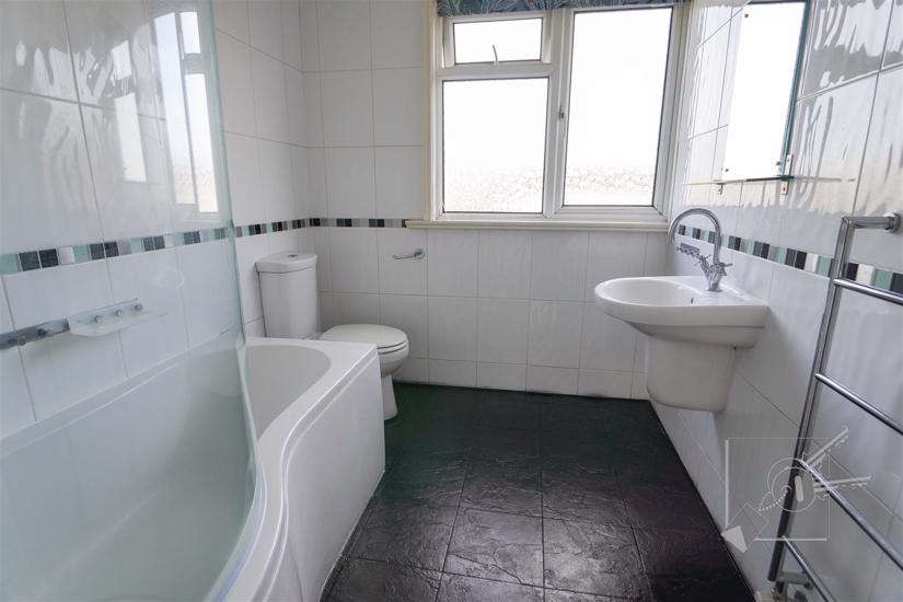 A white bathroom suite, comprising 'P' bath with shower over, low level w.c., wall mounted sink, tiled walls, tiled floor and large double glazed window to rear.