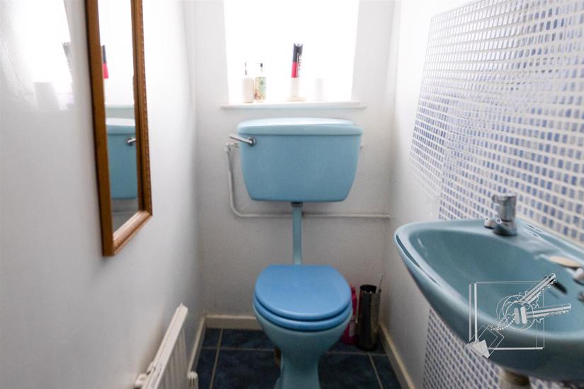 Double glazed window to side, sky blue suite comprising low level w.c, wash basin, radiator.