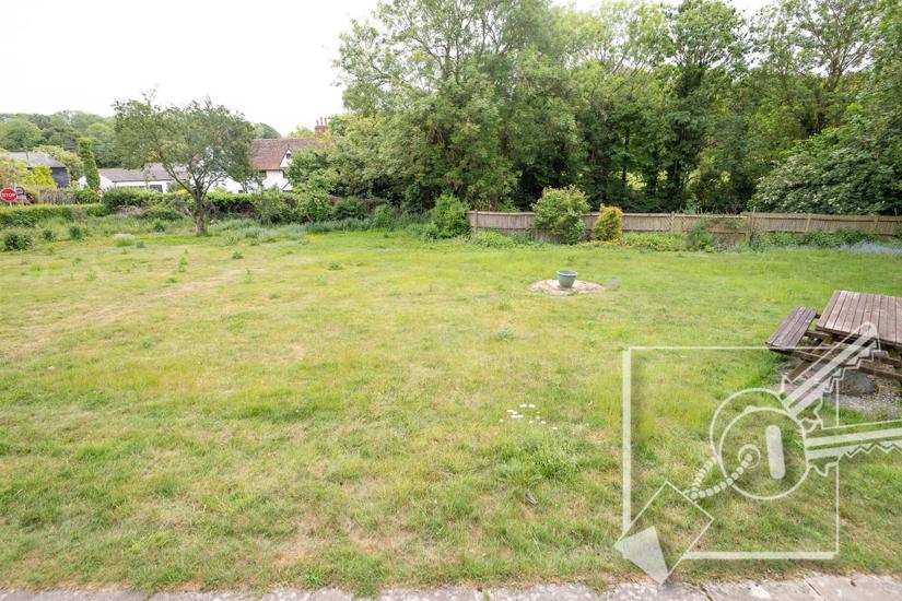 A large plot laid to lawn with various sheds perfect for storage. To the side of the property is a spacious patio with a small pond, and flower beds. Mature shrubs, trees and hedges line the borders of the property for extra privacy.