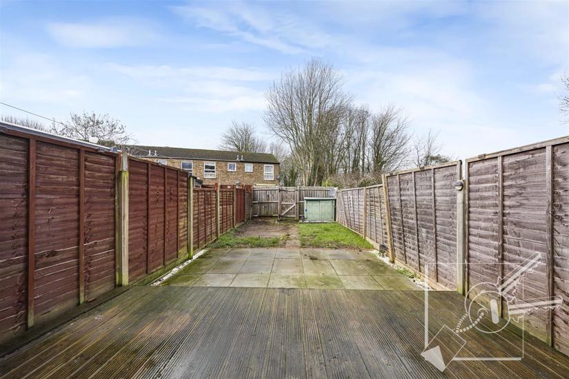 Timber decking, paved patio, grass, garden tool storage container, fenced to sides and rear and rear gate.