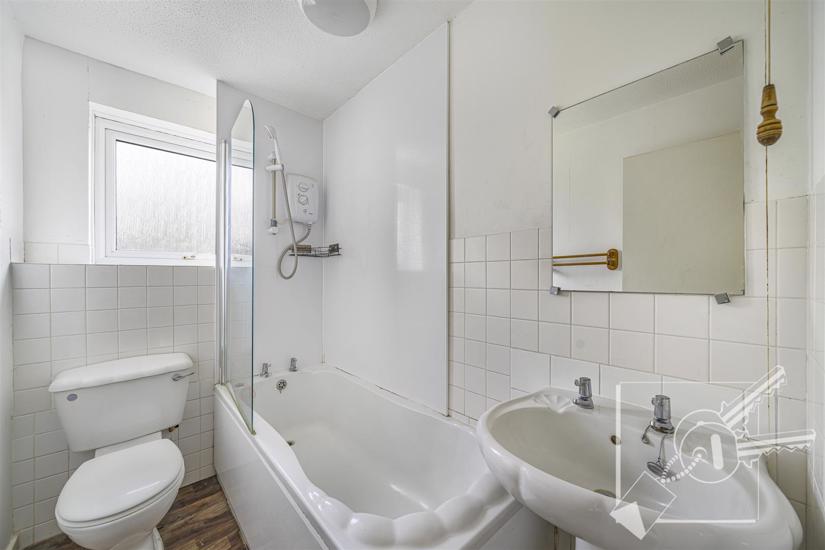 Double glazed window to rear. White shell design suite comprising panelled bath with Triton shower unit over, low level w.c. pedestal wash basin. Heated towel rail, Vinyl flooring, local tiling to walls and Aqua board style panel to shower area.