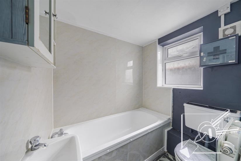Double glazed window to side, radiator, white suite comprising panelled bath, pedestal basin and low level w.c.