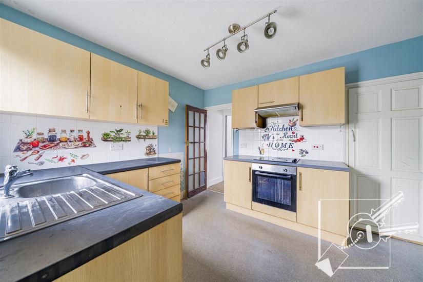 Double glazed window to rear, vinyl floor, radiator, under stair cupboard. Whirlpool ceramic hob, "Lamona" built in oven and extractor hood, Beech effect wall and base units, plumbing for washing machine.