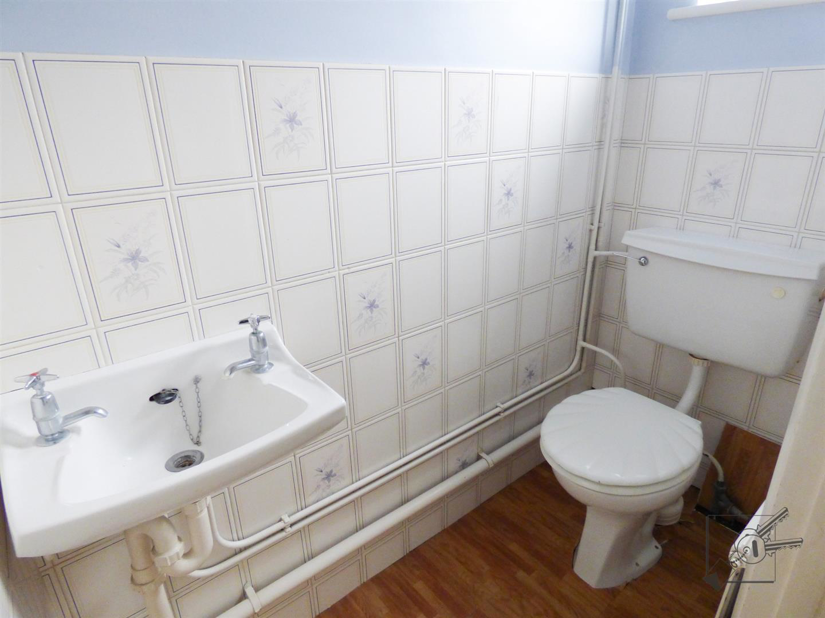 A downstairs cloakroom with part tiled walls with WC and wash basin, single glazed opaque window to front.