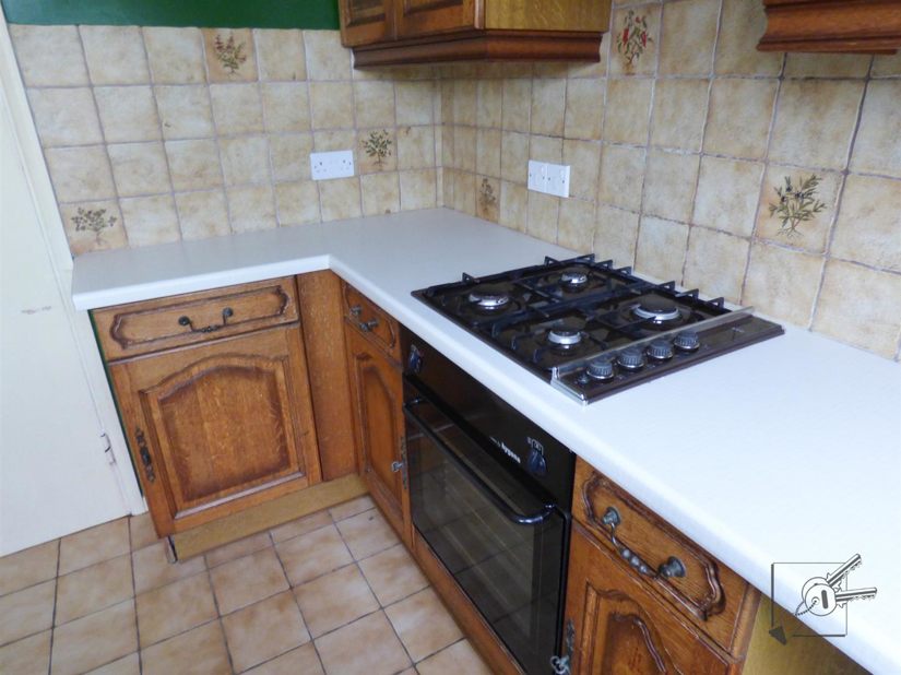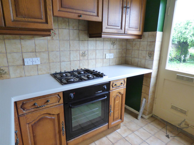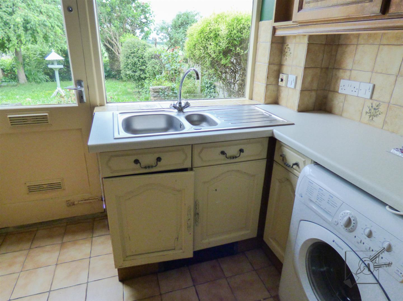 Fitted with a range of wall and base units with a roll top worksurface. Built in electric oven, gas hob and extractor, with tiled splashback. One and a half bowl stainless steel sink and drainer with glazed window over, out to garden. Built in washer/ dryer and space for under counter fridge. Wood and glazed door leading into garden.