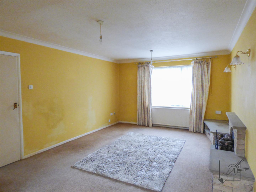 An open plan living room with double aspect secondary glazed windows to front and rear, flooding the room with light. A wall hung electric heater and a decorative sandstone effect fireplace with electric fire.