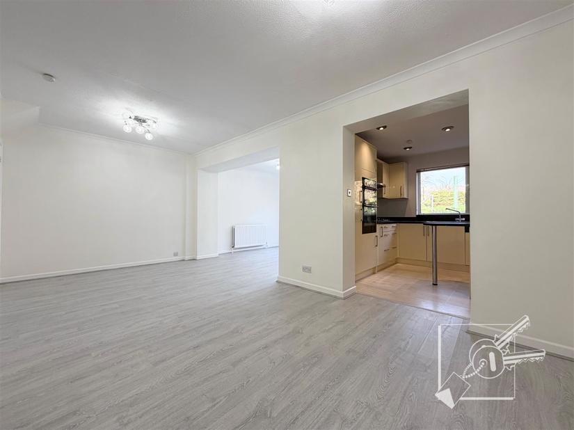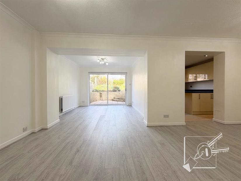 The property has been redecorated throughout and benefits from new flooring and carpets. The ground floor includes a spacious living room, a large dining area with patio doors leading to the rear garden, a fitted kitchen, a downstairs W/C, and internal access to the garage.