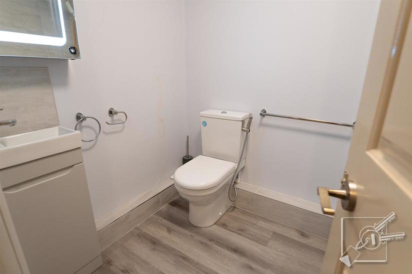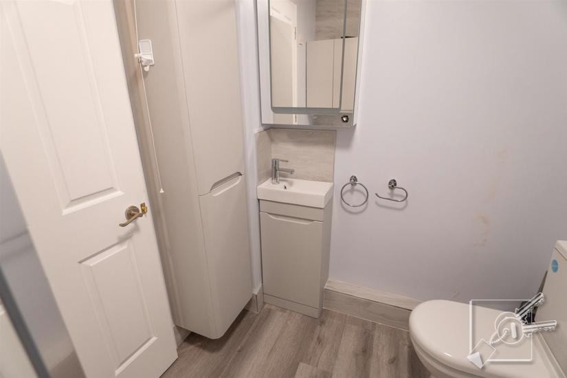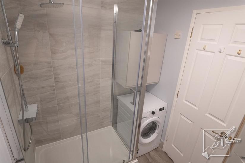 Recently installed modern suite comprising shower cubicle with tiled walls and glass screen, hand basin, low level w.c.. Illuminated mirror front wall mounted cabinet, fitted cupboard. Plumbed for washing machine.