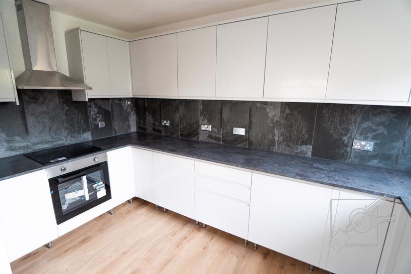 Double glazed window to side. Newly fitted wall and base units, complimentary work tops, round stainless steel sink and drainer, Built in oven, hob and extractor. Plumbed for washing machine. contemporary local tiling to walls.