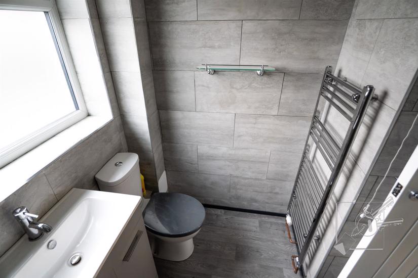A double glazed window to rear, radiator, contemporary localised tiling to walls, two radiators. Suite includes double shower cubicle with glass sliding door & Bristan shower unit, pedestal wash basin and low level w.c..