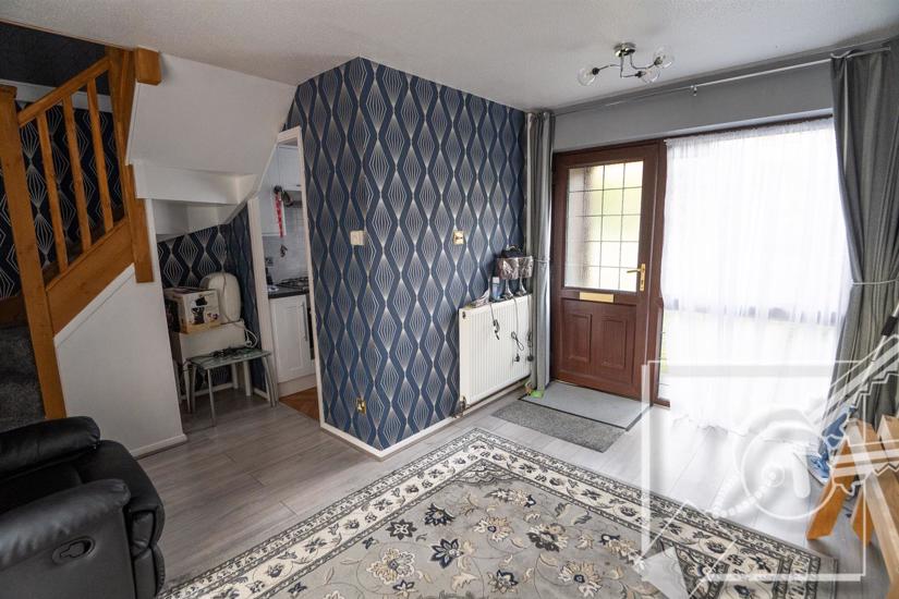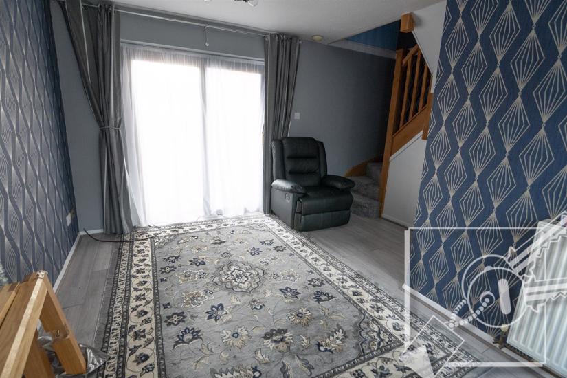 An L shaped room with double glazed picture window to front over looking the front gardens and double glazed patio doors leading out to the rear courtyard. Two radiators, grey laminate floor. Space for lounge furniture and small dining table. under stair storage cupboard Access to kitchen.