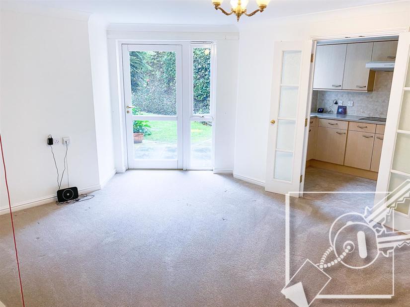 Carpet as laid, single door with window to side leading onto the patio area. Two glazed georgian style doors leading to the kitchen. Ornamental fireplace.