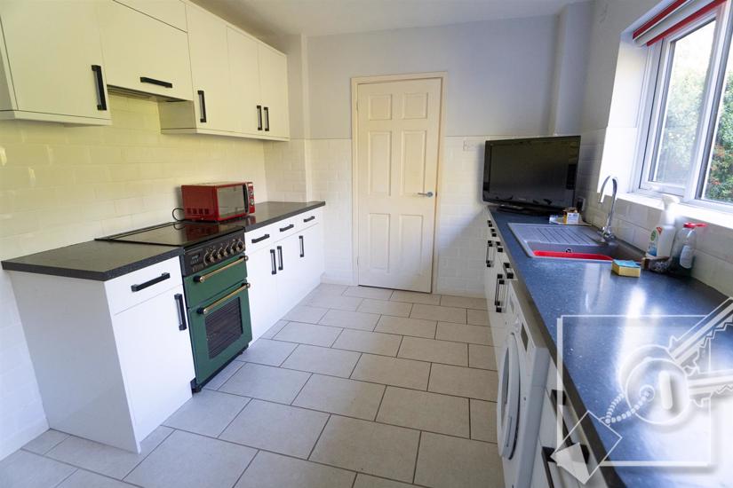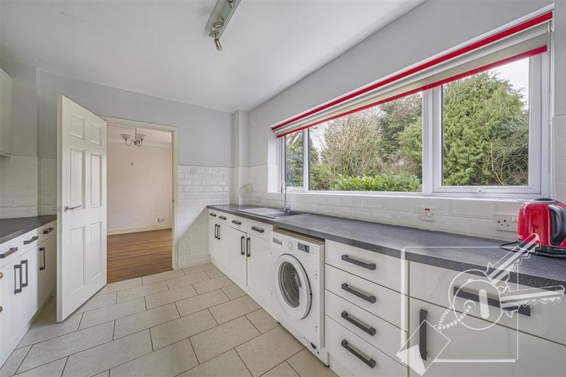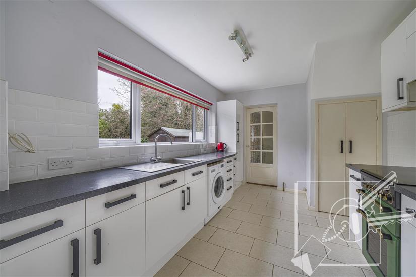 Double glazed window to rear, under stair cupboard, white wall and base cupboards. Plenty of work surfaces, sink and drainer, gas cooker point, plumbed for washing machine. Tiled floor, local tiling to walls, door to: