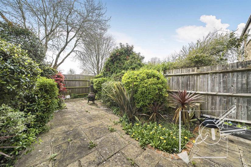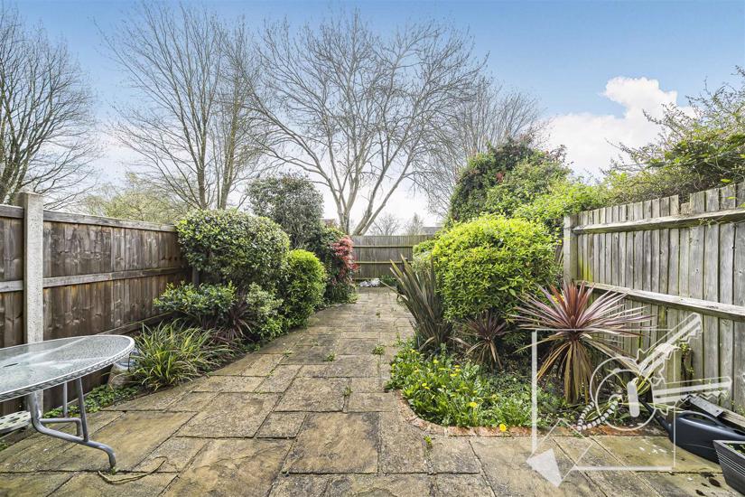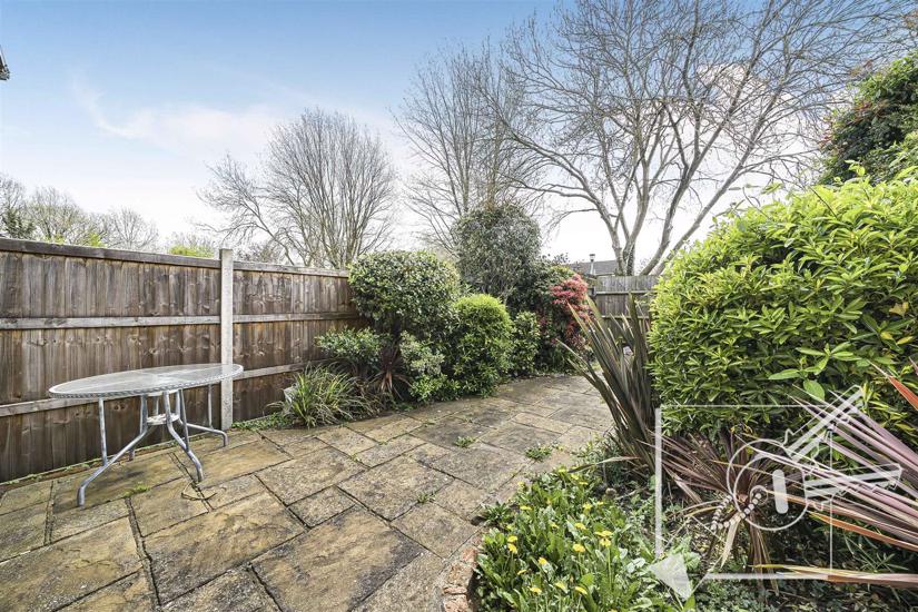 An attractive, easy maintenance paved rear garden with shrubs and bushes. Fully fenced.